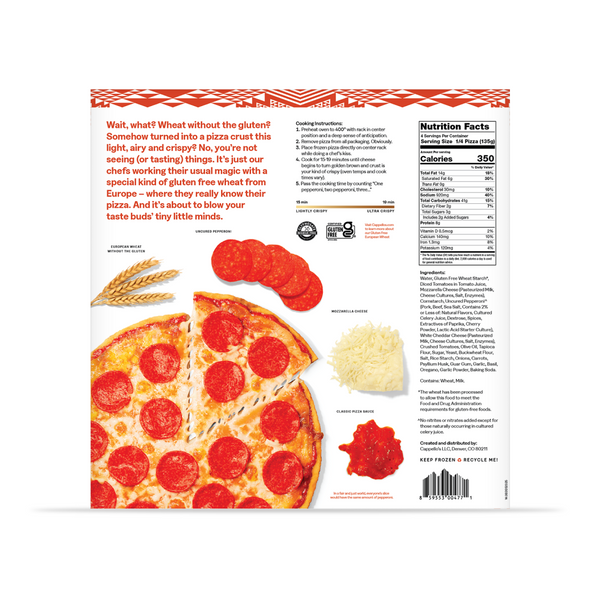Water, Gluten Free Wheat Starch*, Diced Tomatoes in Tomato Juice, Mozzarella Cheese (Pasteurized Milk, Cheese Cultures, Salt, Enzymes), Cornstarch, Uncured Pepperoni (Pork, Beef, Sea Salt, Contains 2% or Less of: Natural Flavors, Cultured Celery Juice, Dextrose, Spices, Extractives of Paprika, Cherry Powder, Lactic Acid Starter Culture), White Cheddar Cheese (Pasteurized Milk, Cheese Cultures, Salt, Enzymes), Crushed Tomatoes, Olive Oil, Tapioca Flour, Sugar, Yeast, Buckwheat Flour, Salt, Rice Starch, Onions, Carrots, Psyllium Husk, Guar Gum, Garlic, Basil, Oregano, Garlic Powder, Baking Soda.