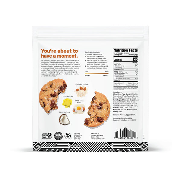 Gluten Free Flour Blend (White Rice Flour, Almond Flour, Tapioca Starch, Brown Rice Flour, Coconut Flour), Cane Sugar, Chocolate Chips (Sugar, Unsweetened Chocolate, Cocoa Butter, Sunflower Lecithin, Natural Vanilla Extract), Coconut Oil, Eggs, Butter (Cream, Lactic Acid), Molasses, Sea Salt, Natural Flavor, Baking Soda