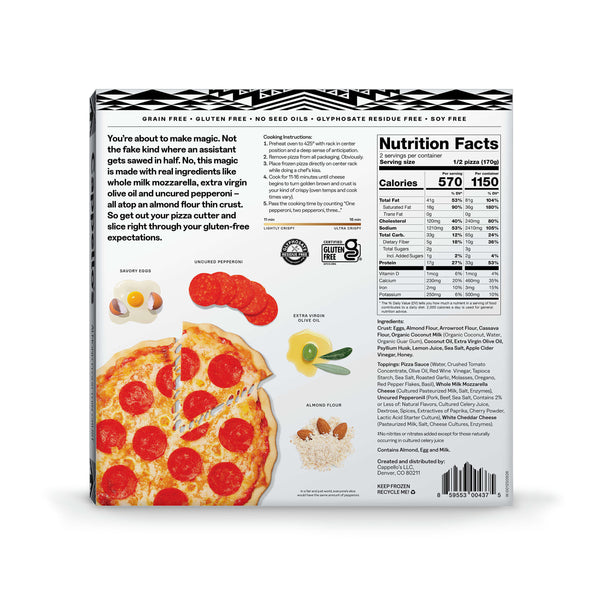 Toppings: Pizza Sauce (Water, Crushed Tomato Concentrate, Olive Oil, Red Wine Vinegar, Tapioca Starch, Sea Salt, Roasted Garlic, Molasses, Oregano, Red Pepper Flakes, Basil), Whole Milk Mozzarella Cheese (Cultured Pasteurized Milk, Salt, Enzymes), Uncured Pepperoni‡ (Pork, Beef, Sea Salt, Contains 2% or Less of: Natural Flavors, Cultured Celery Juice, Dextrose, Spices, Extractives of Paprika, Cherry Powder, Lactic Acid Starter Culture), White Cheddar Cheese (Pasteurized Milk, Salt, Cheese Cultures, Enzymes).